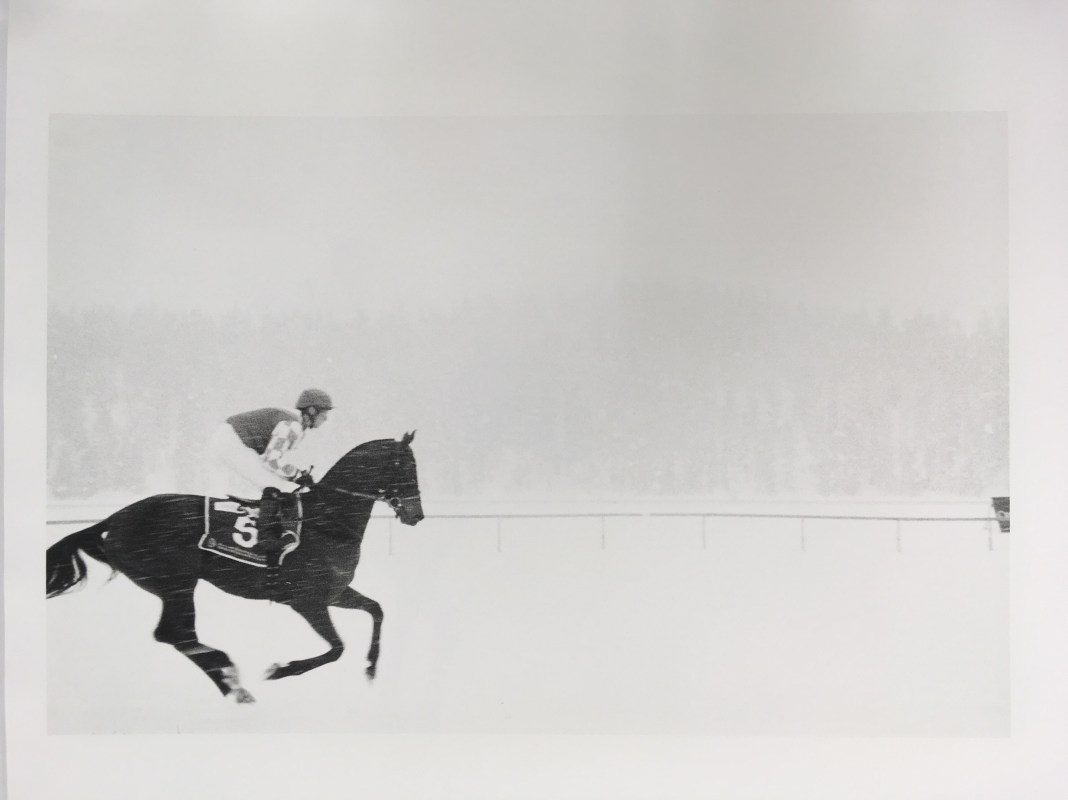 Die Arbeit White Turf ist am 22.04.2016 entstanden. Die analogen Bilder habe ich im Engadin wo ich aufgewachsen bin aufgenommen. Den Film habe ich in der Dunkelkammer selber entwickelt und die Negative analog vergrössert / «geprinted». Jedes Jahr im Februar findet der Event White Turf, des Pferderennsports auf dem gefrorenen St. Moritzer See statt. Im Jahr 2014 begab ich mich an einem der Renn-Sonntage mit meiner analogen Kamera auf den See und hielt, seit meiner Kindheit mir vertraute Spektakel, fest. Der Himmel war gegen meinen Erwartungen nicht stahl blau sondern weiss verhangen und der Schnee viel verspielt davon. Aus diesem Grund habe ich mich für einen schwarz-weiss Film entschieden. Im Frühling 2016 habe ich den Film aus der Versenkung einer meiner Schubladen befreit und bearbeitet.